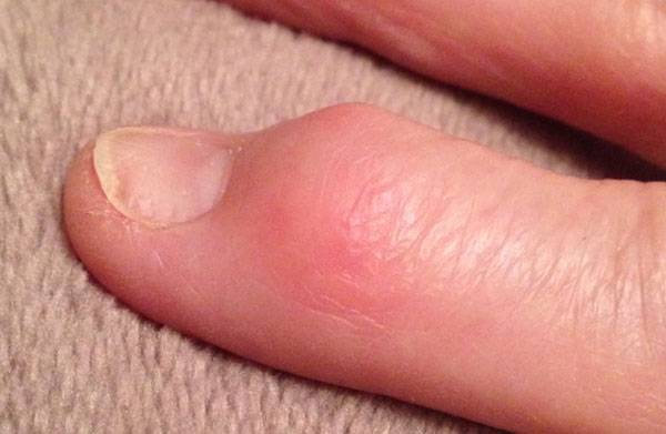 - Сильно припухший (припухлость, отечность распространяются на прилегающие ткани).