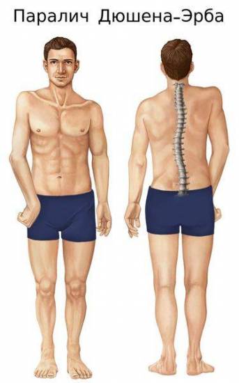 - Параличе дельтовидной мышцы, когда пациент не может отводить руку в стороны. Синонимом является название «синдром Эрба»;