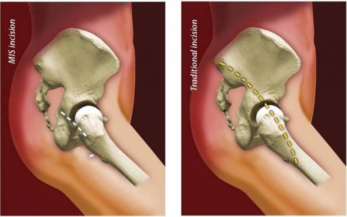 Во многих клиниках практикуют малоинвазивный подход, используя почти в 2 раза меньший разрез, чем при традиционном вмешательстве. Однако и передовые хирурги с достаточным опытом все больше сходятся во мнении, что лучше лишний раз не рисковать, а использовать проверенную, традиционно устоявшуюся тактику, стандарт протезирования – создавать аккуратный разрез с прямого бокового доступа, длиной приблизительно в 13 см.