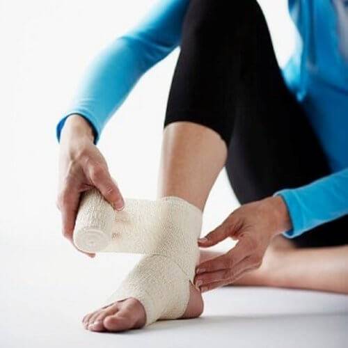 После приведения поврежденной ноги в состояние покоя, лечение лучше начинать с иммобилизации – обмотать травмированный участок эластичным бинтом. До проведения процедуры рентгенографии это поможет профилактировать возможный перелом. Можно использовать специальные ортопедические повязки – ортезы. Они уменьшат болевые ощущения, будут способствовать прекращению отека, предохранят от внешних воздействий.
