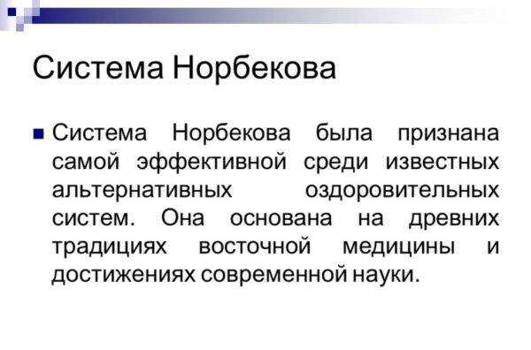 Норбеков создал систему, представляющую собой комплекс упражнений, составленный методом тщательного подбора. При этом достаточно много внимания уделяется эмоциональной стороне вопроса. По утверждениям народного целителя успех во многом зависит от настроя, а не только от техники выполнения упражнений. Эти два понятия являются взаимодополняющими. И о данном аспекте ни в коем случае не стоит забывать. Методика направлена на совершенствование человеческого духа и физического здоровья.